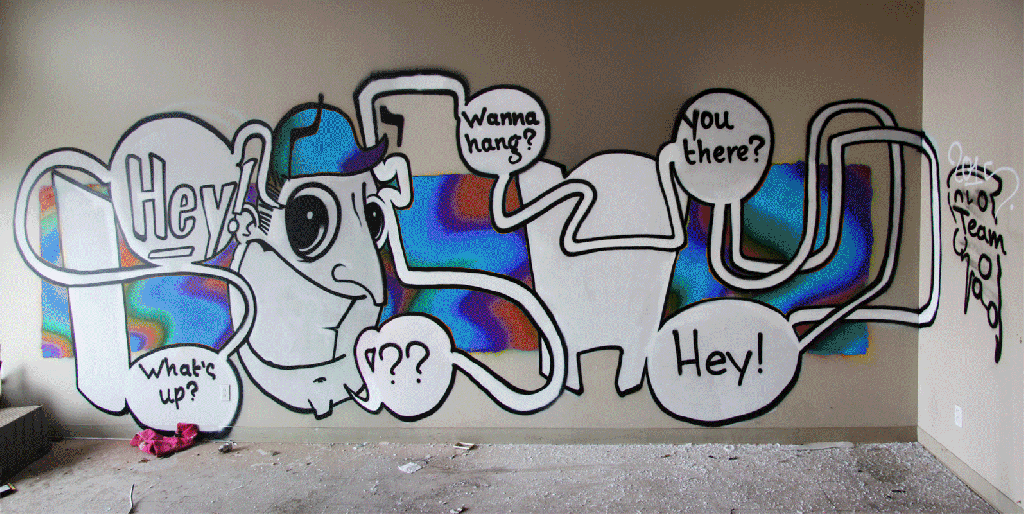 B. – One of the big things was becoming comfortable with the fact that I’m not a very cool person. I’m kind of dorky… I like math related things and I come from a family of dorks. We like shitty puns and exchanging math humour, that’s my family. After adolescence in my early twenties I just embraced it, I realized that’s who I am and I’m proud of it. There was a return to the illusions through acknowledging they’re what I like… I started graffiti when it already existed on the internet, there were graffiti forums people posted photos to. The people who showed me the ropes didn’t start in that same world, they had shoe boxes full of photos, it was a lot more in person. Everyone acted like that was still how graffiti was being treated and looked at, but it wasn’t. You were looking at people’s photos online. I thought, ‘Well shit, I’m not actually making work for people to look at in person!‘ Some of the stuff gets erased right after I paint it. I’m making work for the internet, it’s the elephant in the room. So, I started making works that only existed on the screen, in person the optical illusions are just a lot of squares, but when you take a photo it becomes whole. I made one piece that was just a big glitch, and computers sucked back then. So when someone would look at it they’d say, ‘I thought my Blackberry was broken when it was actually just your photo that did that.’ How can I mess with people and break that 4th wall? It was like the dorky graffiti version of a troll. How can I play with people’s expectations? That became a very fun game for me. You have to look at it upside down, look at it in a mirror, if you look at it in a mirror it’s a different word. It tied in easily with the illusions, I guess it comes from being a smartass and wanting to trick people. I try really hard to be accessible, surprise them, challenge them. If you look at a piece of art and don’t get it a lot of people will say, ‘I’m stupid, I don’t get it, oh I just don’t really get art.’ That’s not the person’s fault, that’s the artist fault. I want to be an artist for the people and I want to make work that people who don’t have three degrees can still understand.
