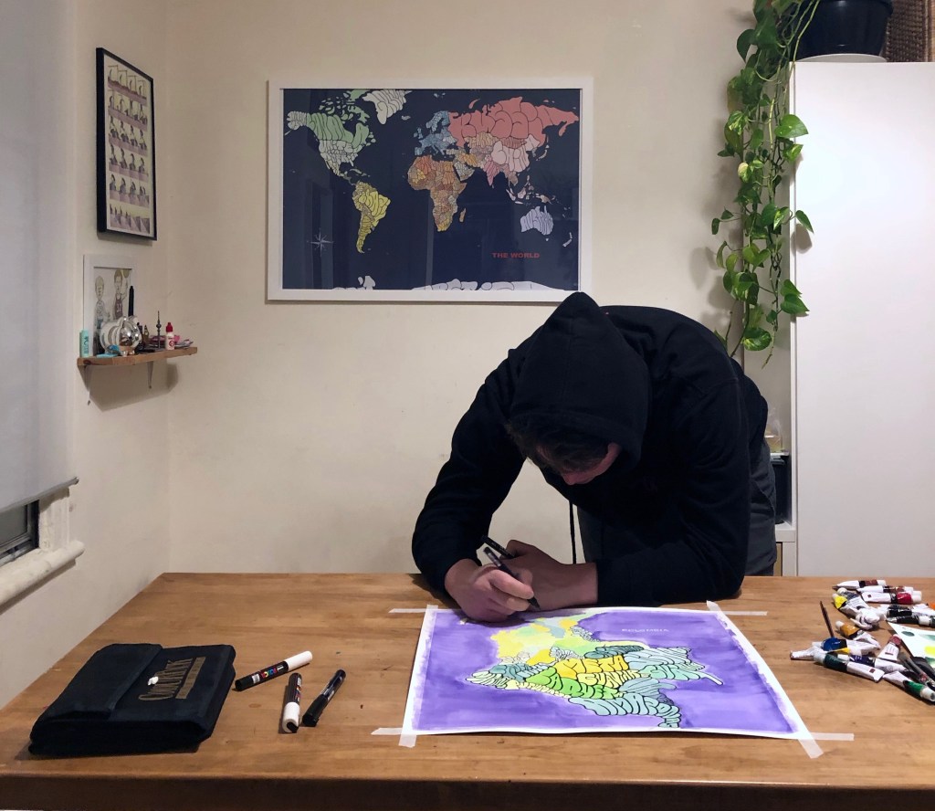 On the 6th of November I sat down with Charles LeMoyne, creator of Island Maps, an ongoing series of graffiti-esque interpretations of country, city and state maps illustrated in the confines of a border’s boundaries. We spoke about his artistic process, content and the battle of digital vs analog over a couple cans of Sapporo at Park Lafontaine.