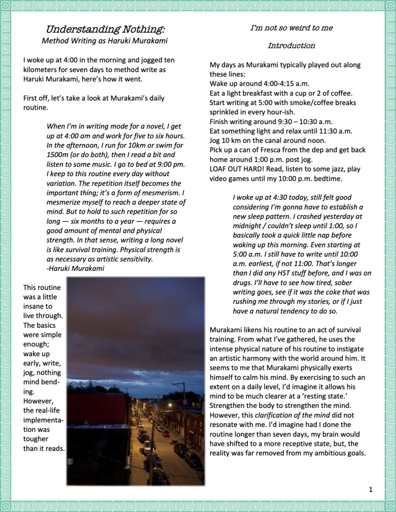Understanding Nothing: Method Writing as Haruki Murakami Written by: Nathaniel Spencer-Cross WwShare this: kiw Share on X (Opens in new window) X Share on Facebook (Opens in new window) Facebook Like Loading...