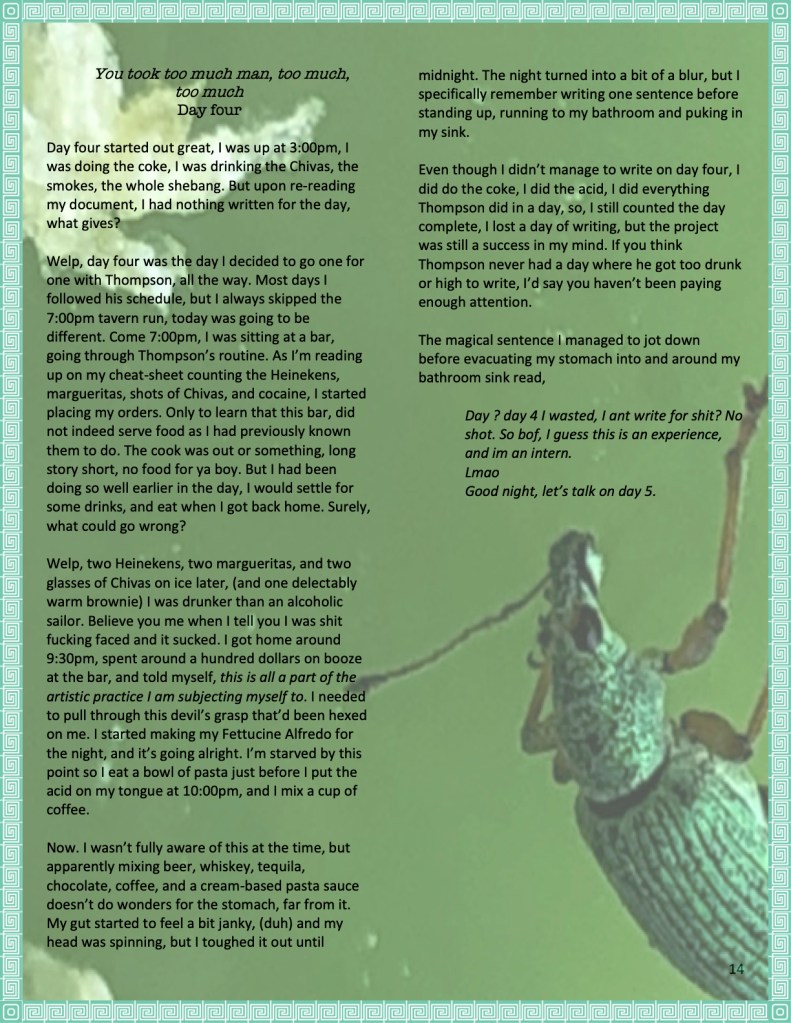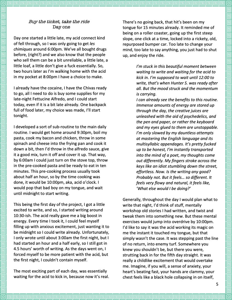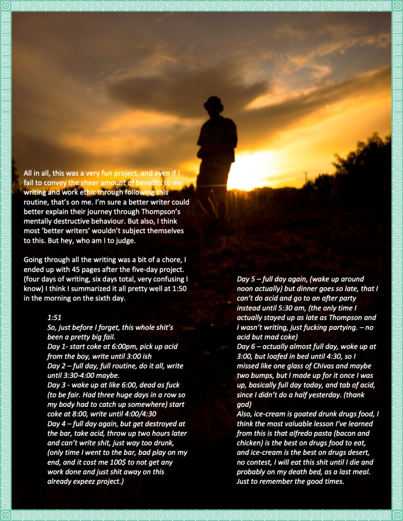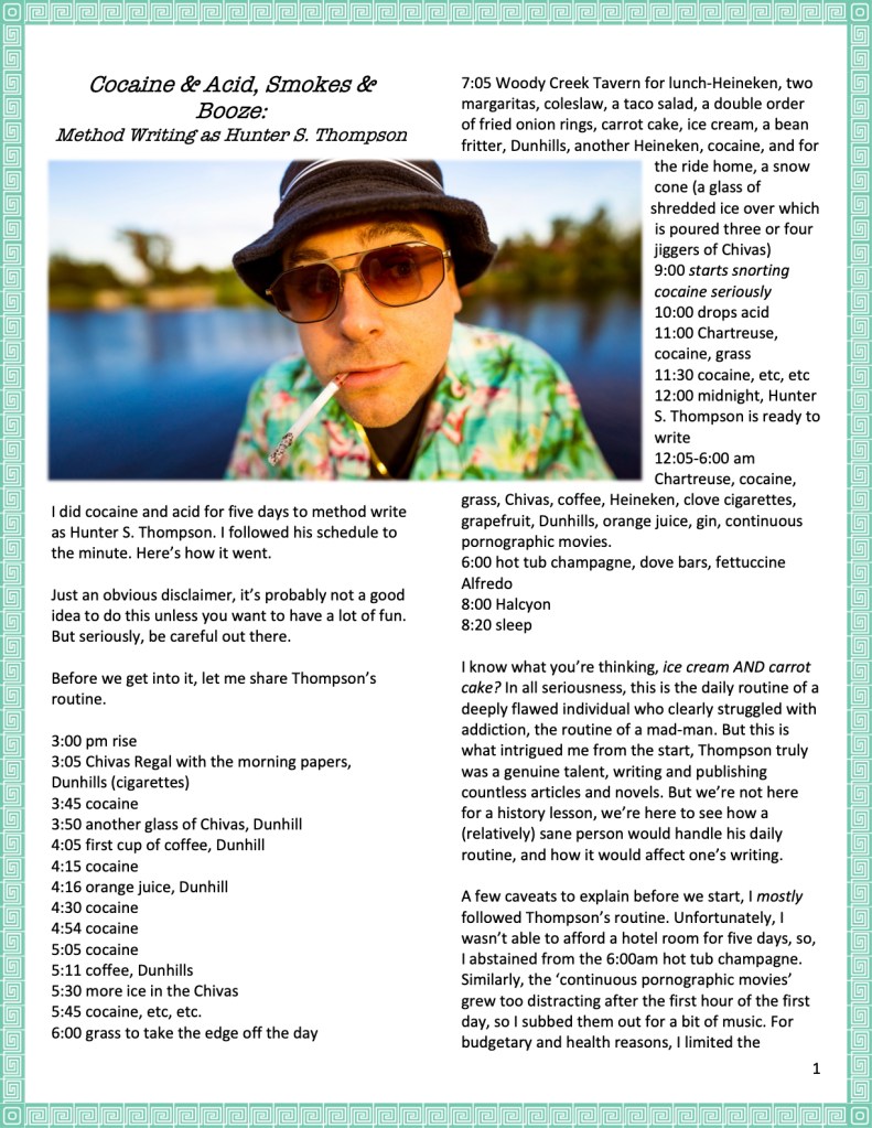 Note from the editor: Hunter S. Thompson did not follow the outlined routine while writing. He did do these things, but not to the extreme listed below, at least not before writing. Another case of unconfirmed Gonzo journalism. Oh well, still had a blast.