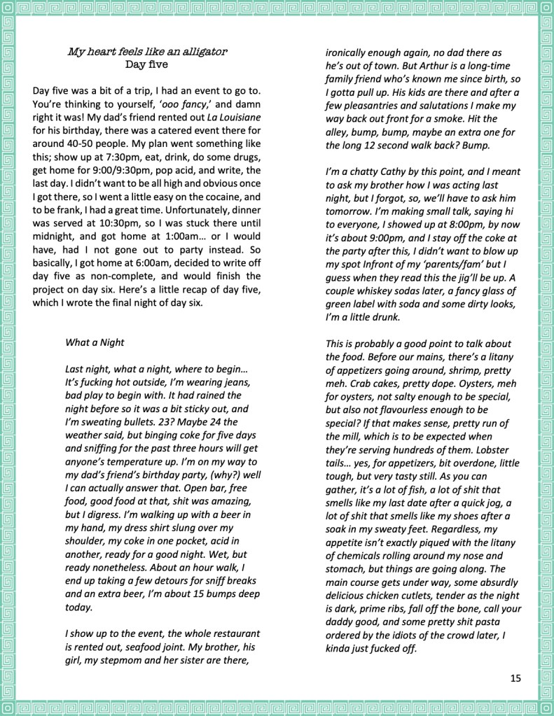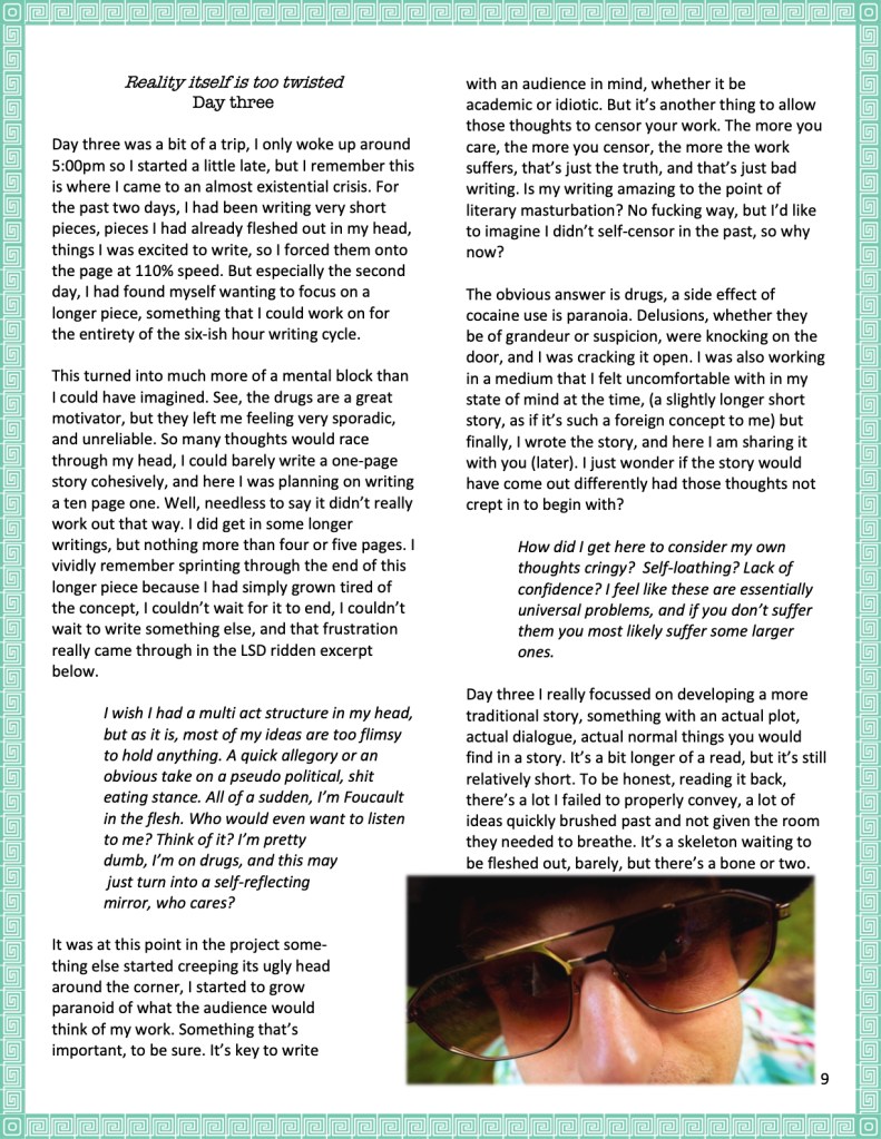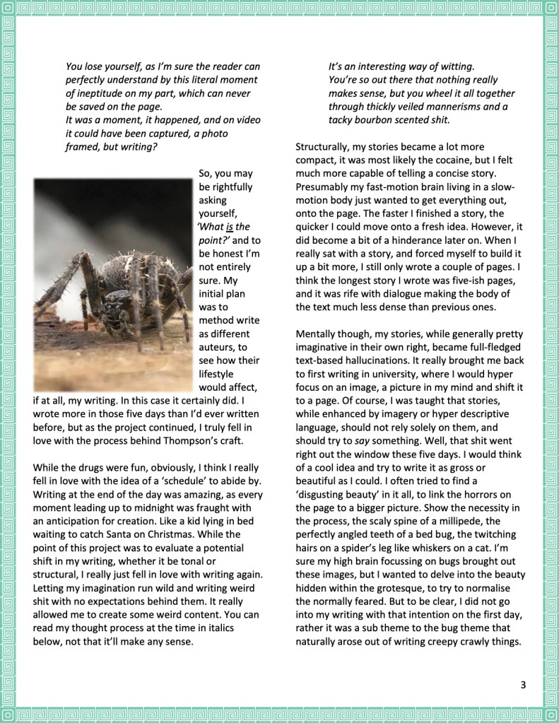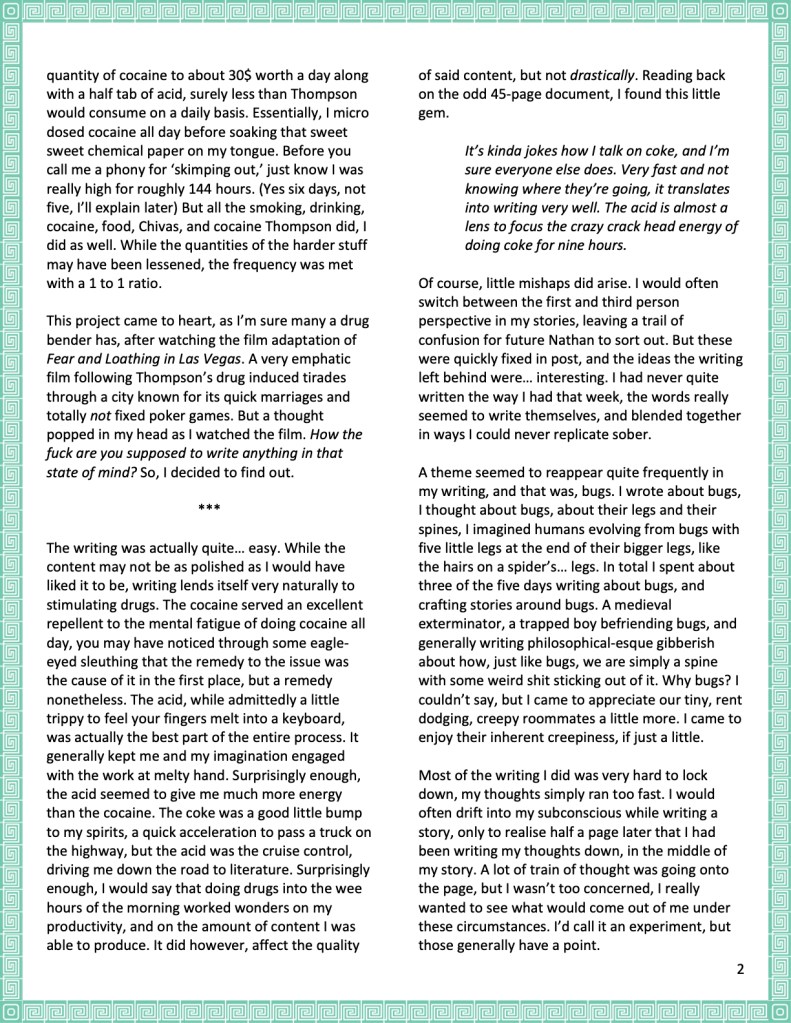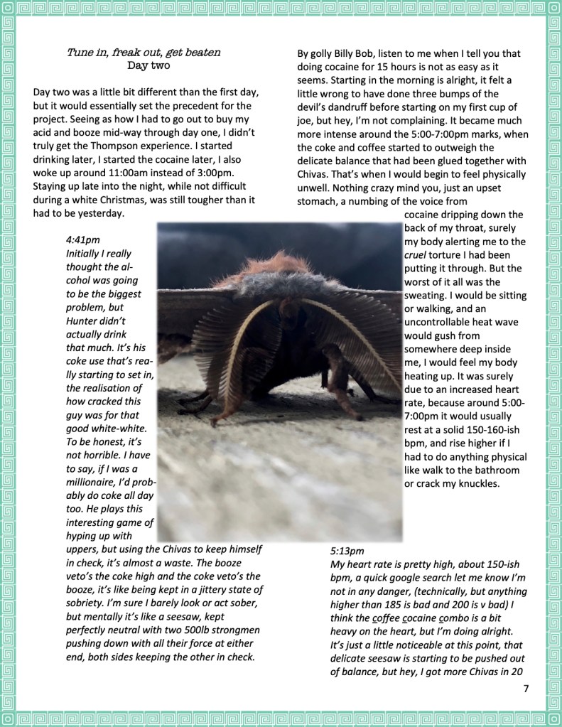 Note from the editor: Hunter S. Thompson did not follow the outlined routine while writing. He did do these things, but not to the extreme listed below, at least not before writing. Another case of unconfirmed Gonzo journalism. Oh well, still had a blast.