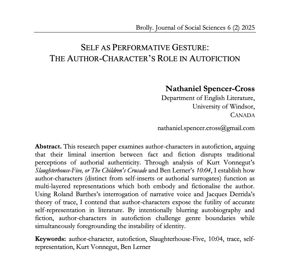 Published in Brolly: Journal of Social Sciences 6 (2), this double blind peer reviewed research paper examines author-characters in autofiction, arguing that their liminal insertion disrupts traditional perceptions of authorial authenticity. Through analysis of Kurt Vonnegut’s Slaughterhouse -Five, and Ben Lerner’s 10:04, I establish how author-characters function as multi-layered representations which embody and fictionalise the author. Using Barthes’s interrogation of narrative voice and Derrida’s theory of trace, I contend that author-characters expose the futility of accurate self-representation in literature. By intentionally blurring autobiography and fiction, author-characters challenge genre boundaries while foregrounding the instability of identity.